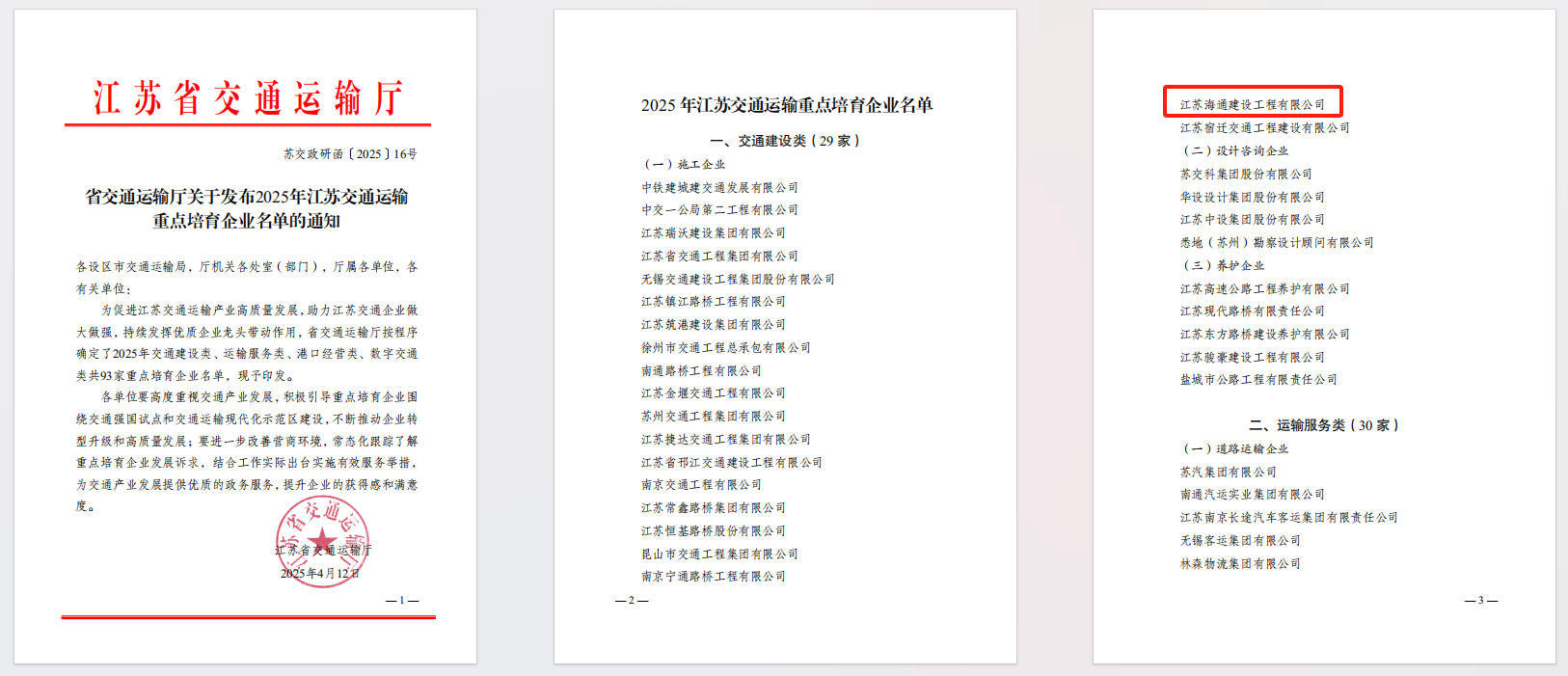 近日,從江蘇省交通運輸廳獲悉,江蘇海建公司入選2025年江蘇交通運輸重點(diǎn)培育企業(yè)名單,位列交通建設類(lèi)施工企業(yè)20強。